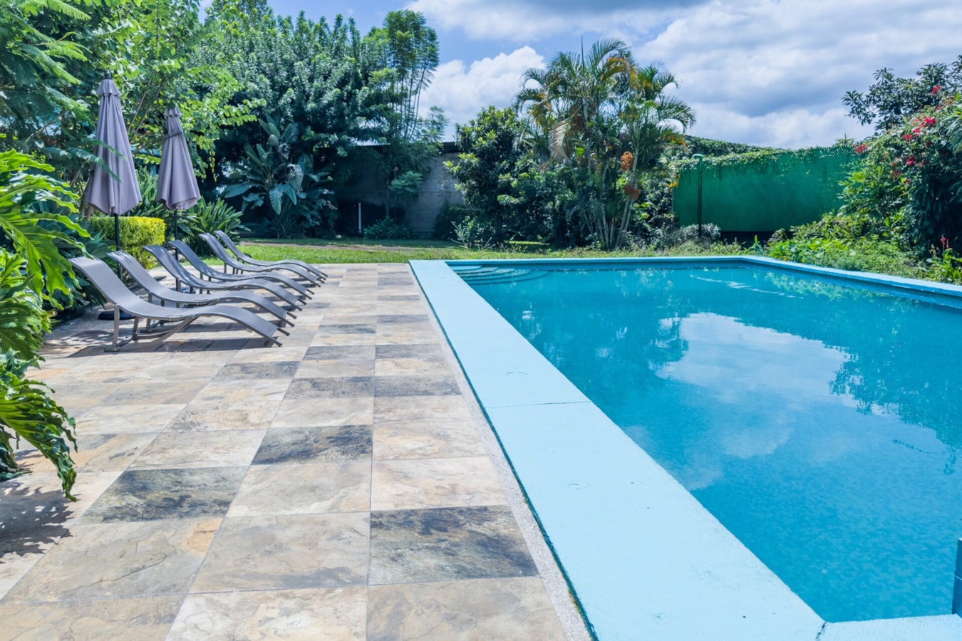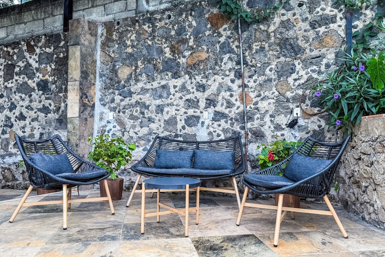 Afuera, el entorno se vuelve parte de la experiencia: terraza con vista a la montaña, jardín exuberante con árboles y rincones para leer o simplemente estar, hamacas que invitan a la pausa y un comedor exterior donde el sol, el viento y la vista acompañan cada momento.
